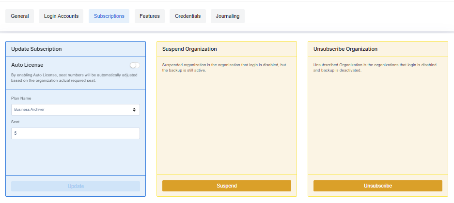 - Auto-Lizenzierung: Wenn diese Option aktiviert ist, wird die Anzahl der Lizenzen für eine Organisation nach oben oder unten angepasst, je nachdem, was benötigt wird, um alle Benutzer zu sichern.