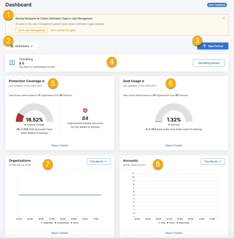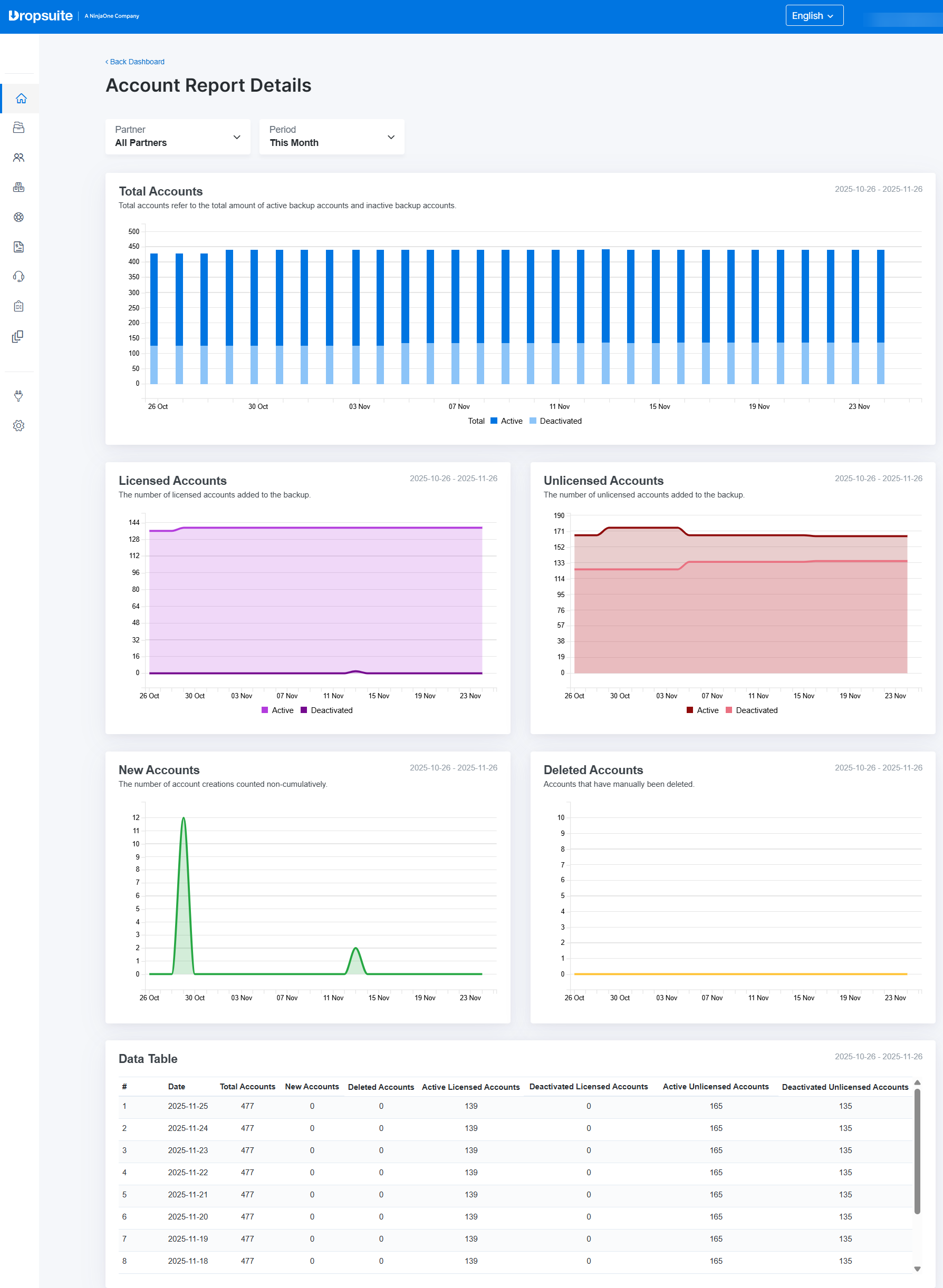 Das Dropsuite-Partnerportal ist der Eckpfeiler unseres Partnerverkaufsprogramms und bietet Partnern Zugang zu Informationen, Ressourcen und Support für Dropsuite-Produkte. Nach erfolgreicher Anmeldung im Partnerportal leitet Dropsuite die Partnerbenutzer zum Dashboard weiter, das wichtige Diagramme zur Schutzabdeckung, Sitzplatznutzung, Organisationen und Konten anzeigt. Das Dashboard enthält auch Funktionen, die Sie bei der effizienten Verwaltung Ihrer Organisationen und Ressourcen unterstützen.