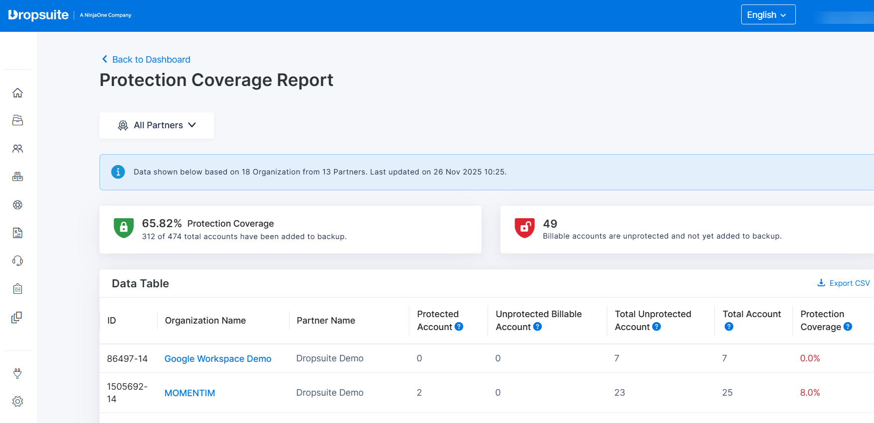 Wenn Sie auf Report Details klicken, zeigt Dropsuite eine Tabelle an, die eine detaillierte Aufschlüsselung der Schutzabdeckung enthält. Wählen Sie CSV exportieren, um die Datei auf Ihrem lokalen Computer zu speichern.