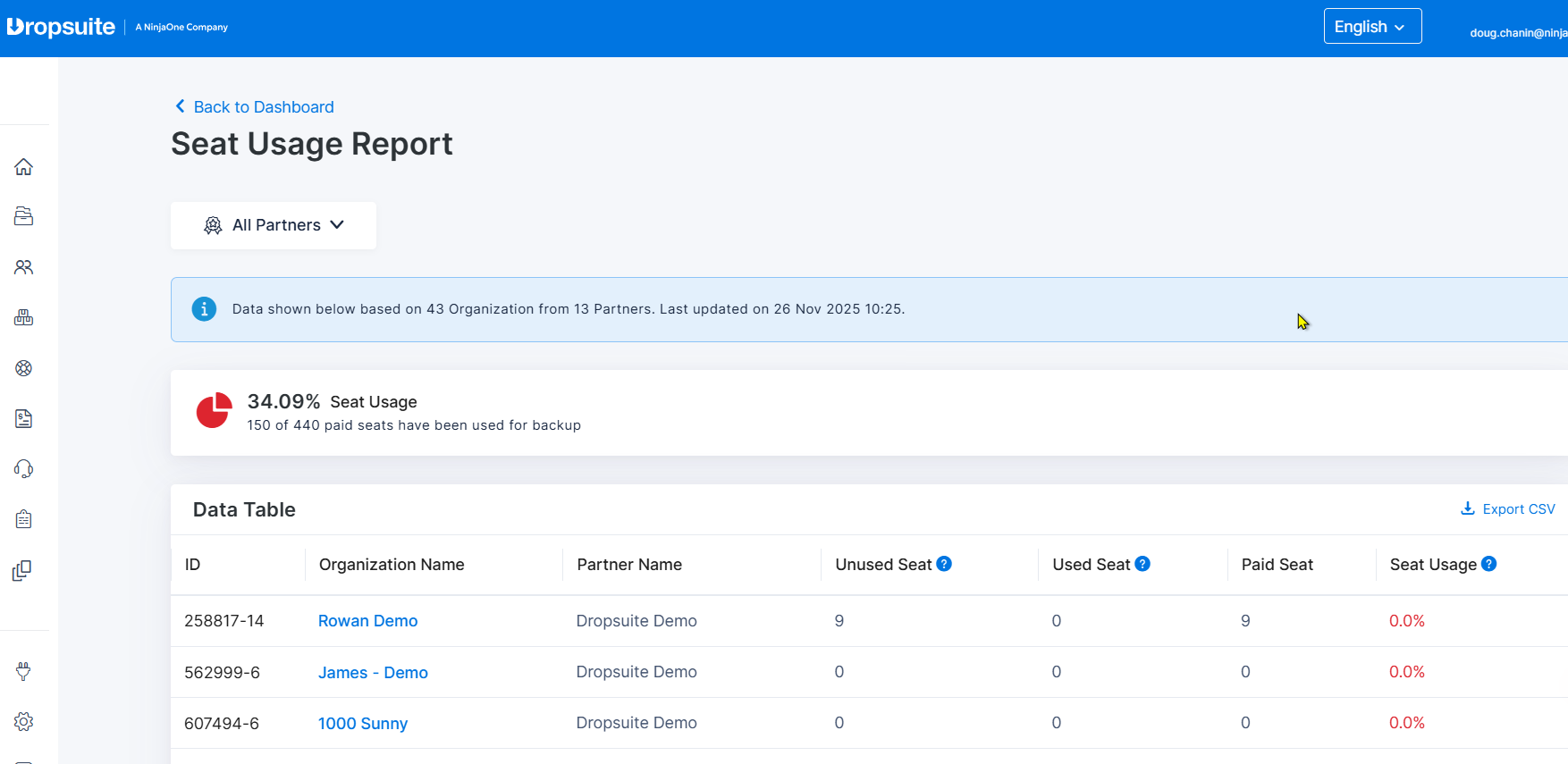 Wenn Sie auf Berichtsdetails klicken, zeigt Dropsuite eine Tabelle an, die eine detaillierte Aufschlüsselung der Sitzplatznutzung enthält. Wählen Sie CSV exportieren, um die Datei auf Ihrem lokalen Computer zu speichern.