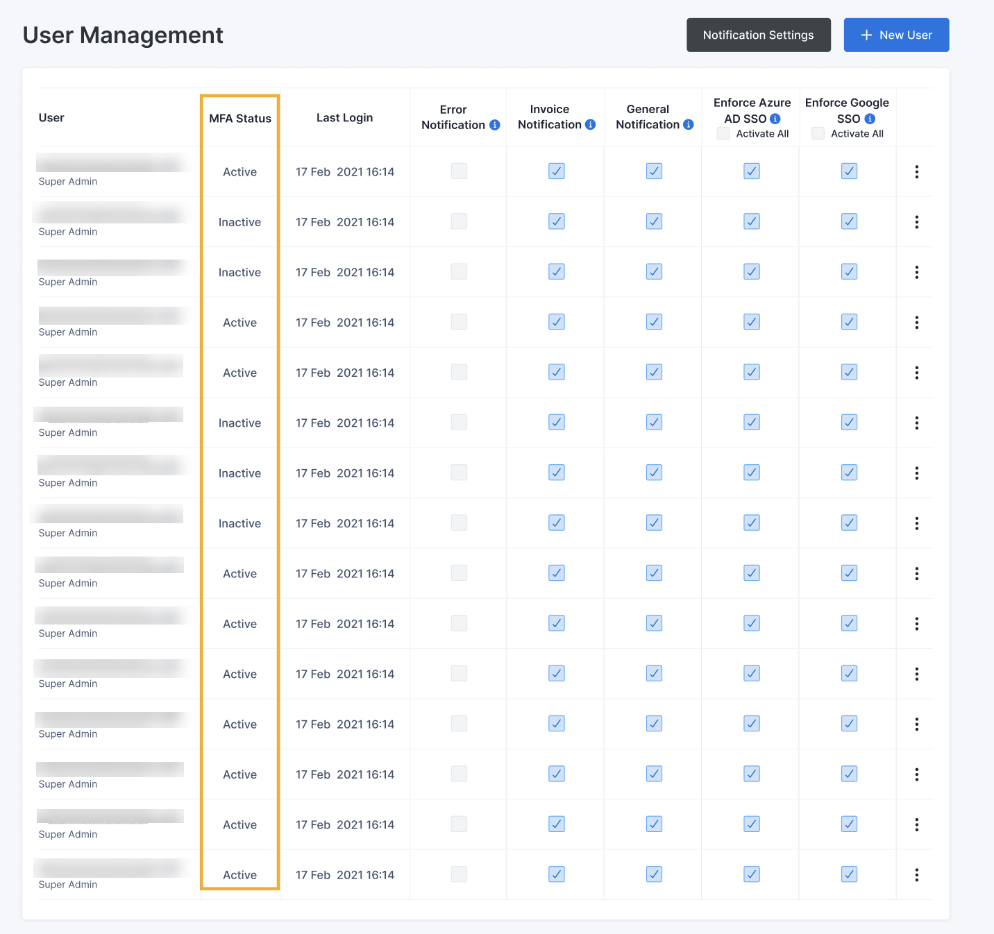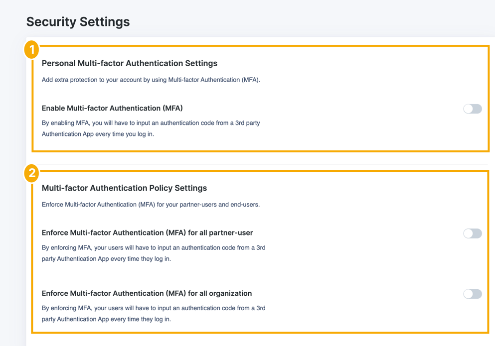 - Durchsetzung von MFA für alle Organisationen: Alle Benutzer innerhalb Ihrer Organisation, einschließlich der Benutzer des Endbenutzerportals, müssen MFA aktivieren.
