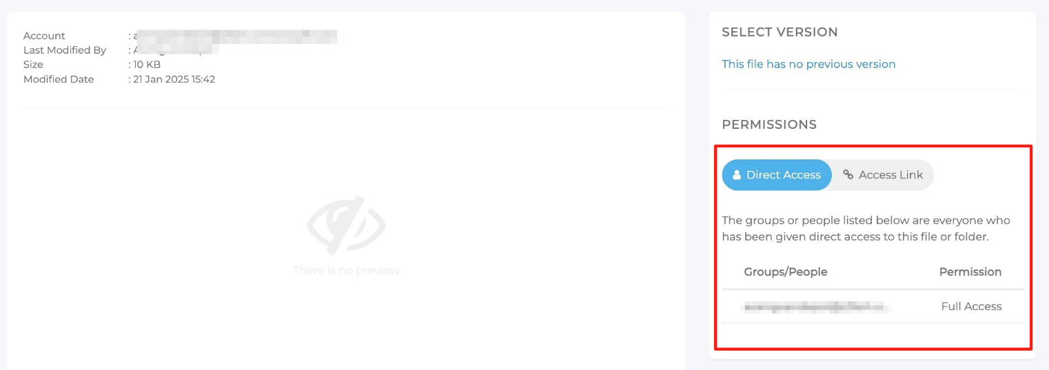 Wenn Sie auf das Schlüsselsymbol klicken, erhalten Sie detaillierte Informationen zu den Berechtigungen, einschließlich Angaben zum direkten Zugriff oder zum Zugriffslink.