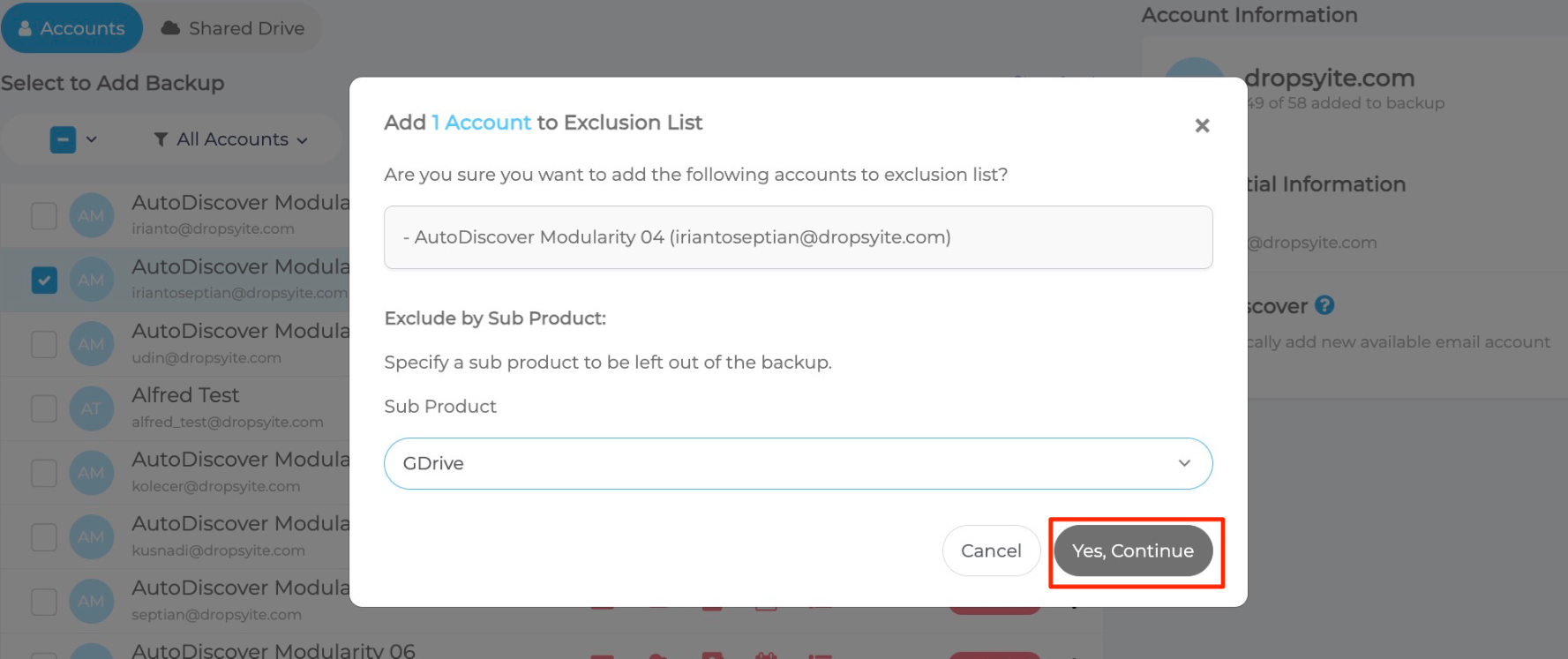 - Wählen Sie im Bestätigungsdialog für den Ausschluss GDrive aus dem Dropdown-Menü für Unterprodukte aus und klicken Sie auf Ja, Weiter.