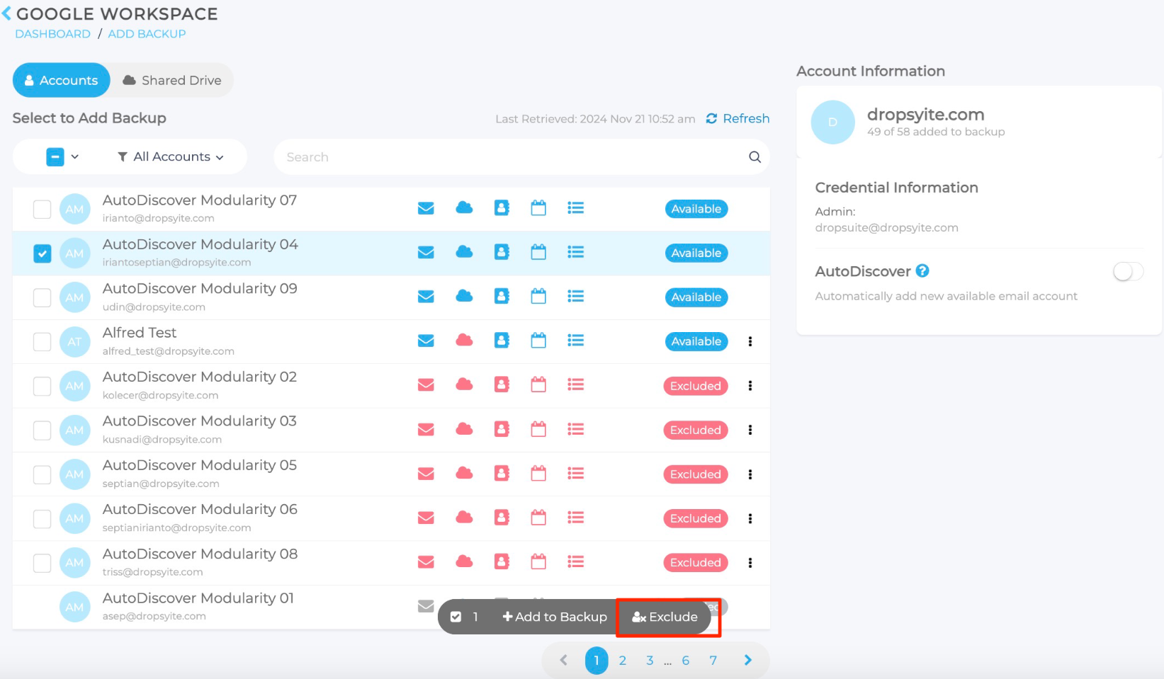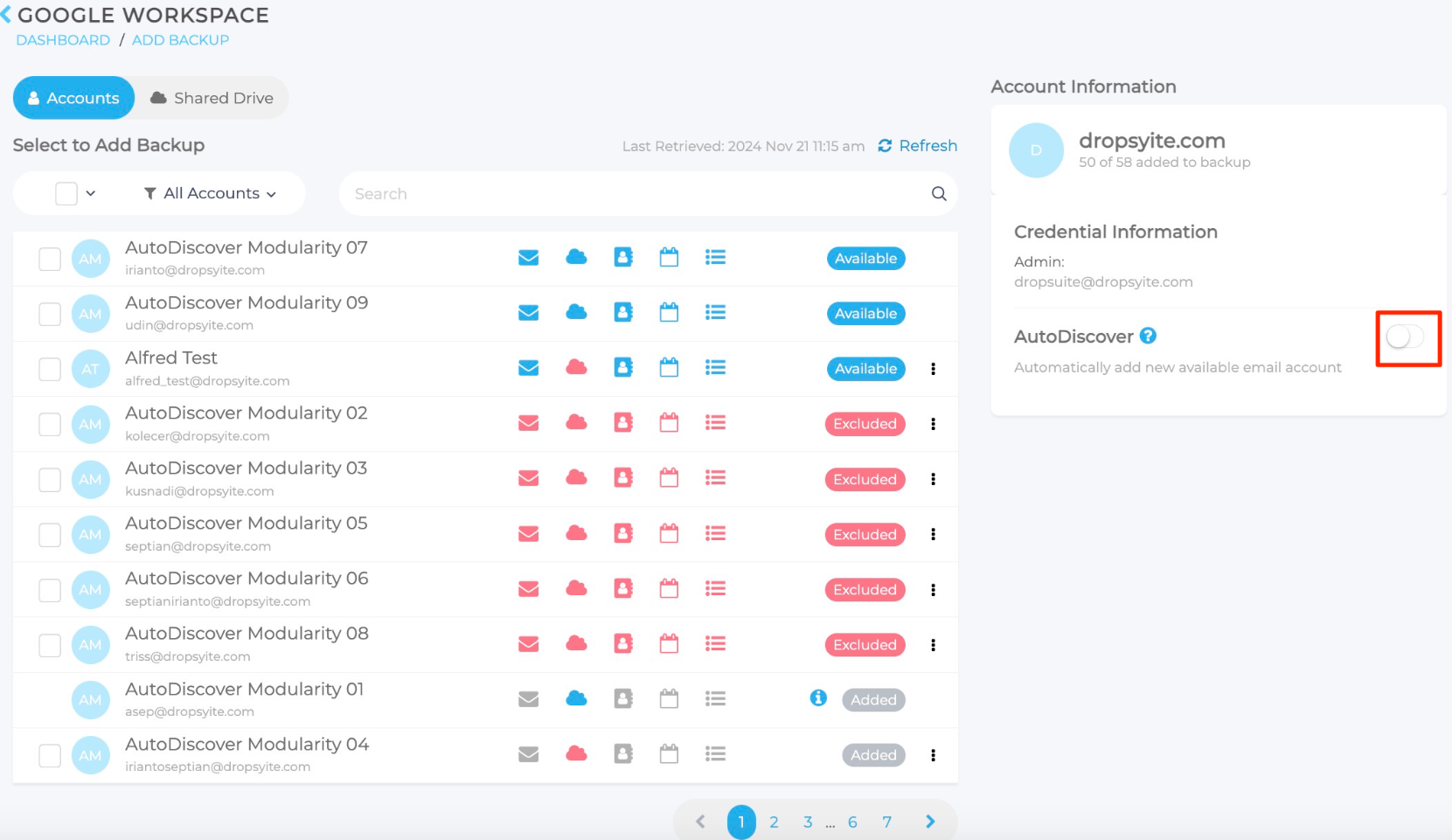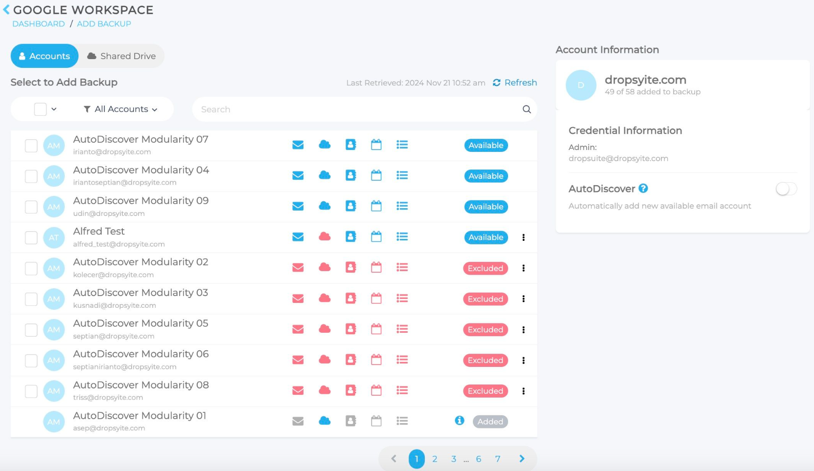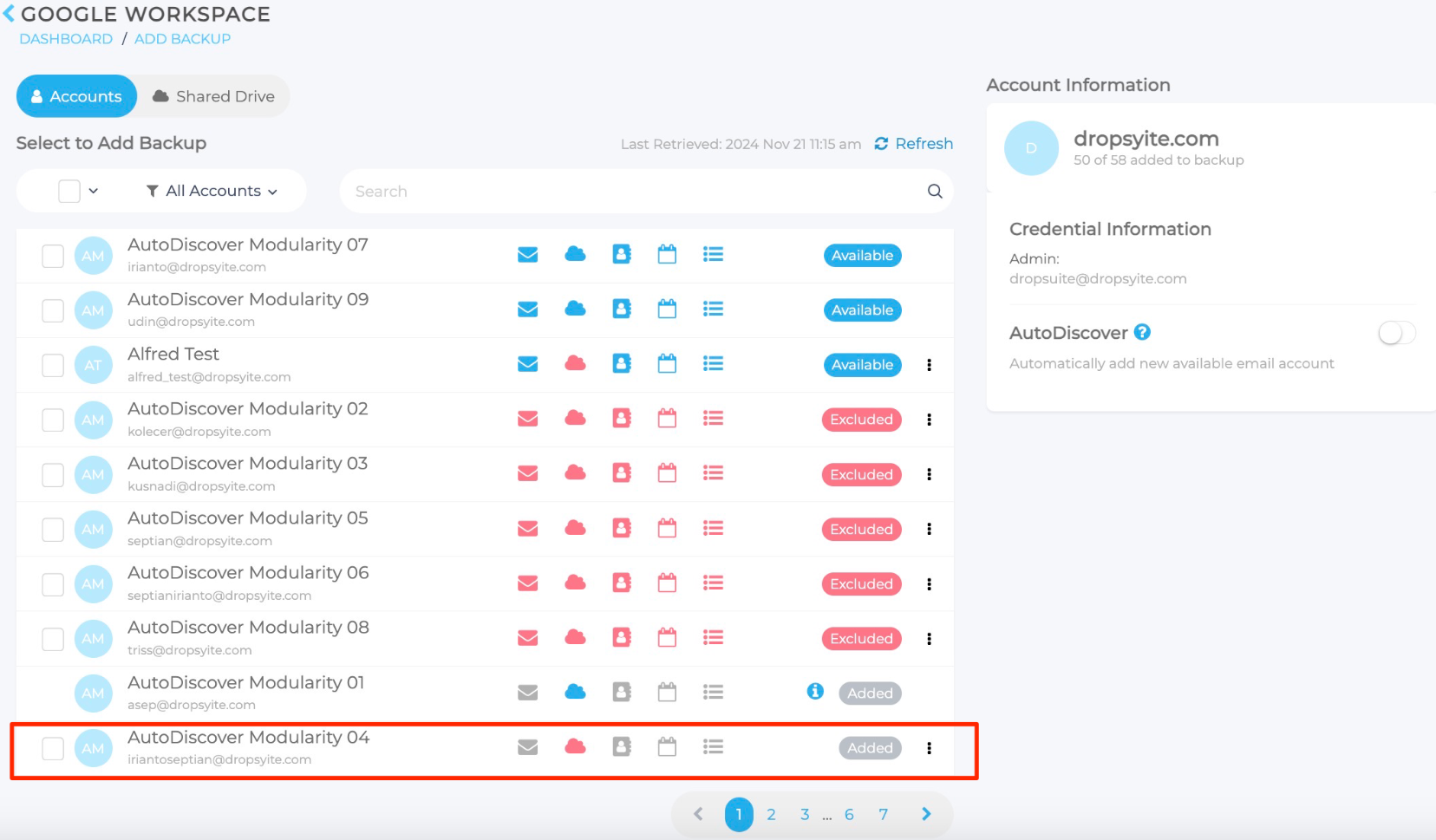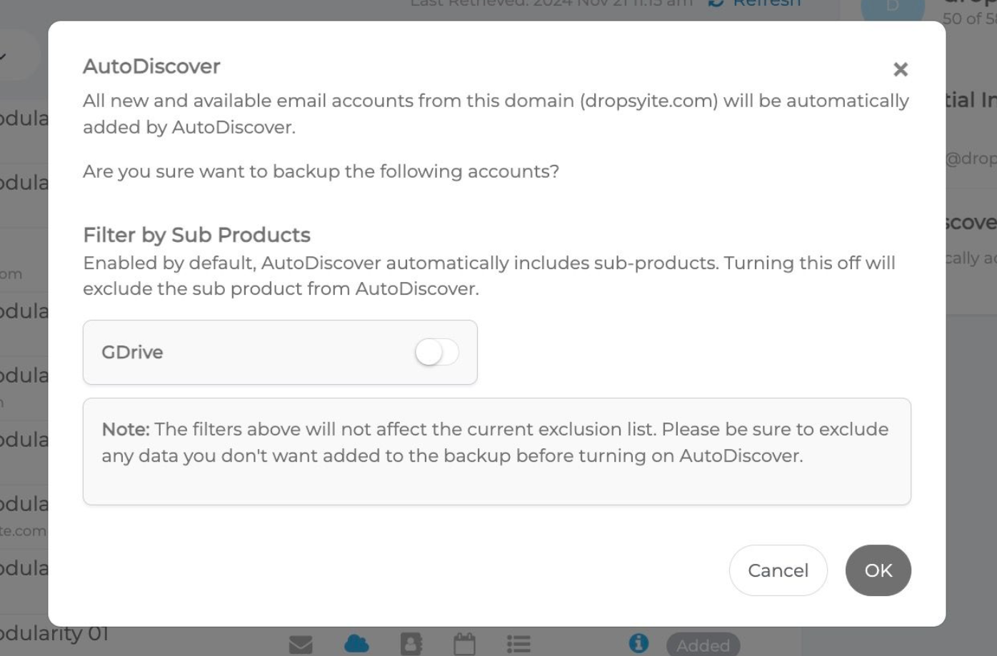 AutoDiscover Backup erkennt automatisch neue Konten (einschließlich Postfächer und Unterprodukte) und bezieht sie in den Backup-Prozess ein. Wenn Sie Google Drive von dem Prozess ausschließen möchten, folgen Sie den unten beschriebenen Schritten.