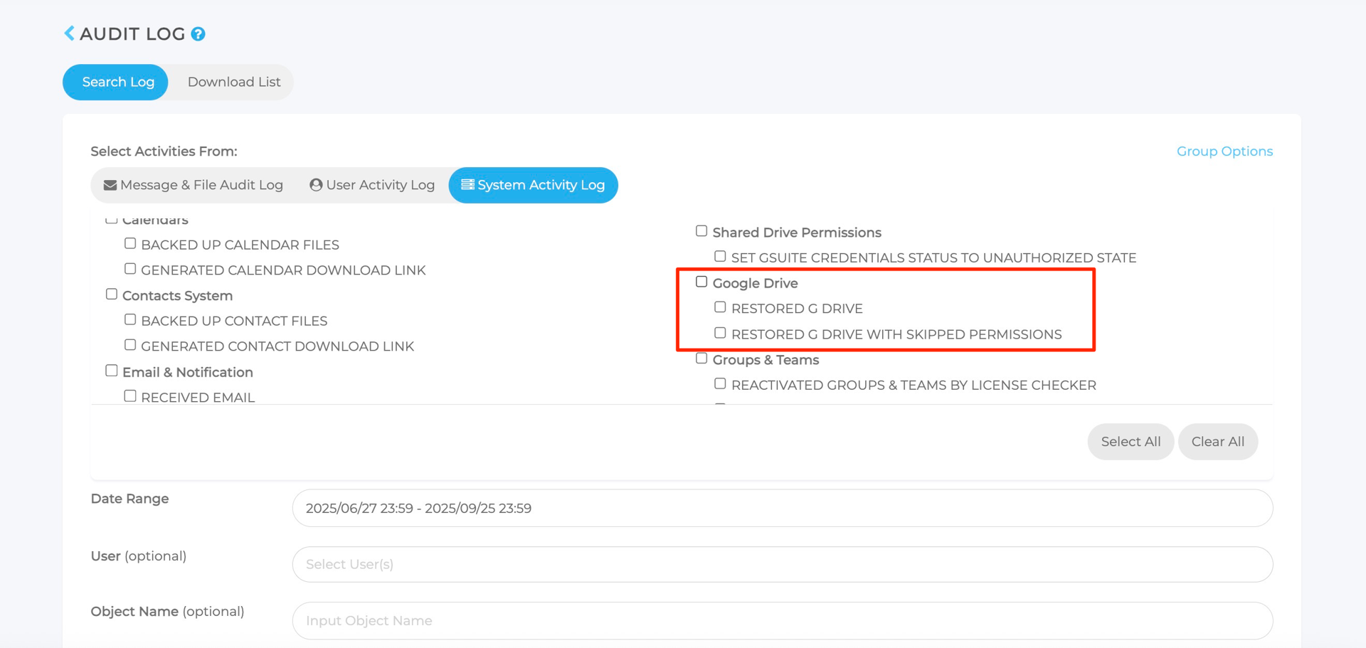 Ja. Wir stellen ein Protokoll zur Verfügung, das Google Drive aus Sicherheits- und Compliance-Gründen im Systemaktivitätsprotokoll aufzeichnet.