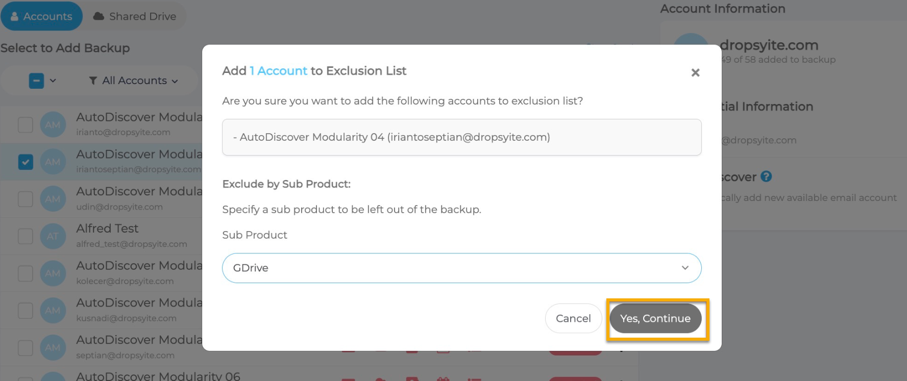 - Wählen Sie im Bestätigungsdialog für den Ausschluss GDrive aus dem Dropdown-Menü des Unterprodukts aus und klicken Sie auf Ja, Weiter.