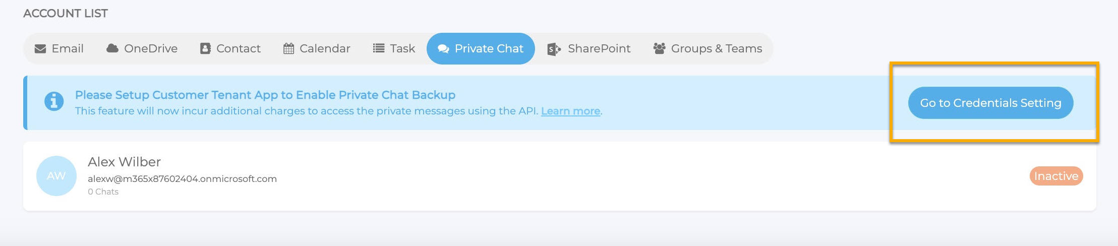 NinjaOne SaaS Backup beinhaltet standardmäßig ein privates Chat-Backup für Unternehmen mit dem Archiver-Plan. Die Sicherung wird jedoch nicht automatisch gestartet. Um mit der Sicherung privater Chats zu beginnen, müssen Sie zunächst die Einrichtung der Zugangsdaten abschließen und dann die Sicherung aktivieren.