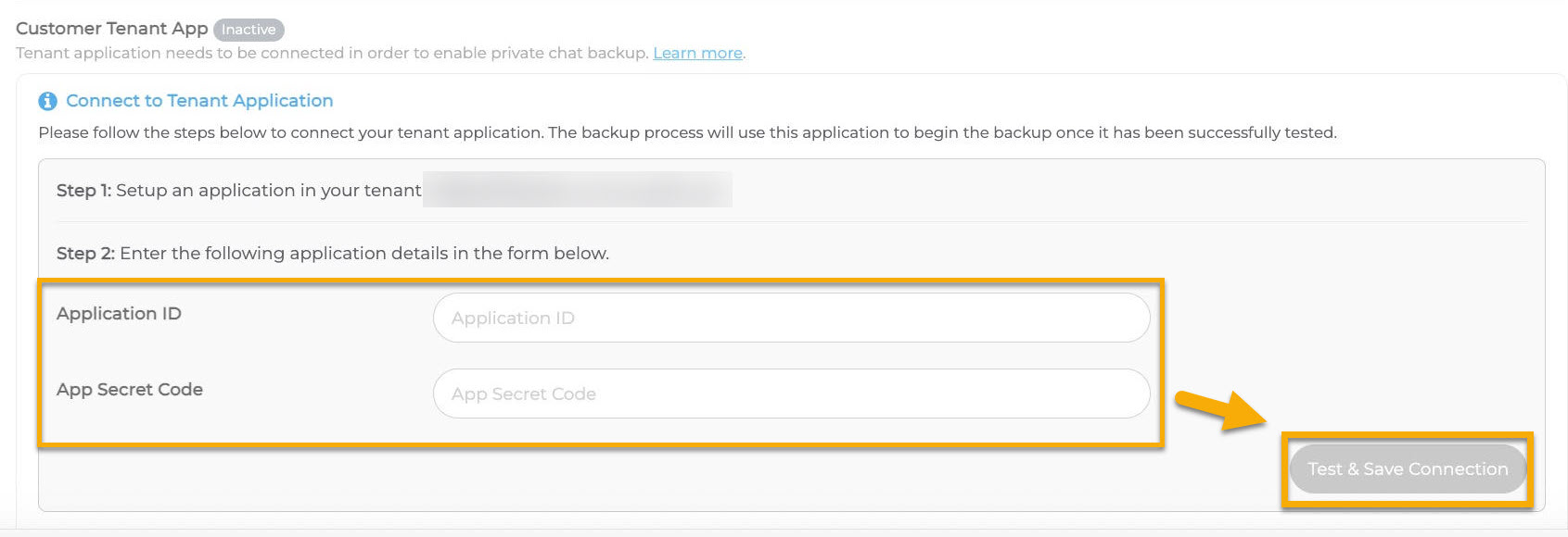 - Geben Sie die korrekte Anwendungs-ID und den Geheimcode der Anwendung ein und klicken Sie dann auf Test & Verbindung speichern, um die Einrichtung abzuschließen. Für weitere Informationen können Sie das Private Chat Backup User Guide herunterladen und lesen. (DOCX)-Datei, die direkt an diesen Artikel angehängt ist.