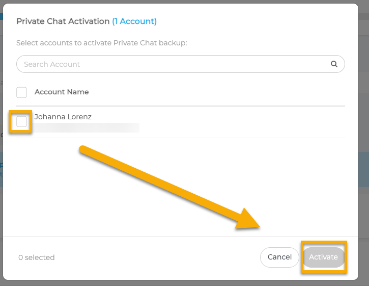 - Wählen Sie im Dialogfeld Aktivierung des privaten Chats die privaten Chat-Konten aus, die Sie sichern möchten, und klicken Sie dann auf Aktivieren.