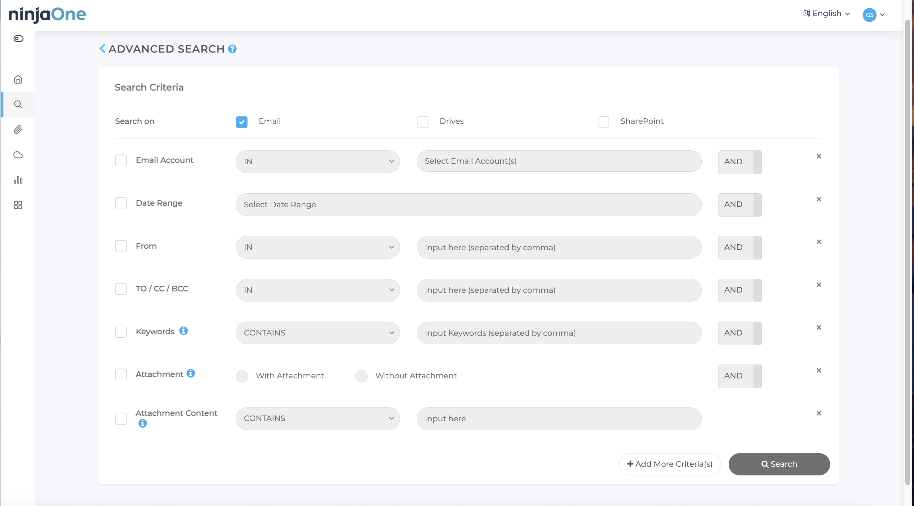 NinjaOne SaaS Backup bietet eine Reihe von Suchkriterien, aus denen Sie auswählen können. Wenn die erforderlichen Kriterien nicht standardmäßig angezeigt werden, klicken Sie auf Weitere Kriterien hinzufügen , um zusätzliche Optionen zu erhalten.