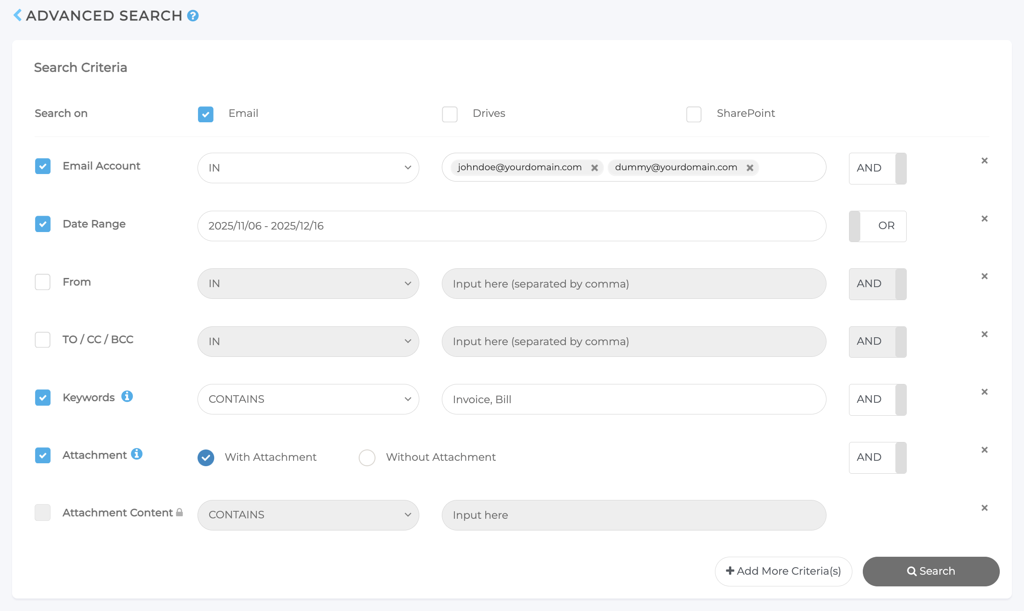 Die erweiterte Suche ermöglicht es Ihnen, E-Mails, Laufwerke oder Microsoft SharePoint-Inhalte anhand mehrerer Suchkriterien zu durchsuchen. Sie können anhand eines oder mehrerer Attribute nach gesicherten oder archivierten Inhalten suchen.