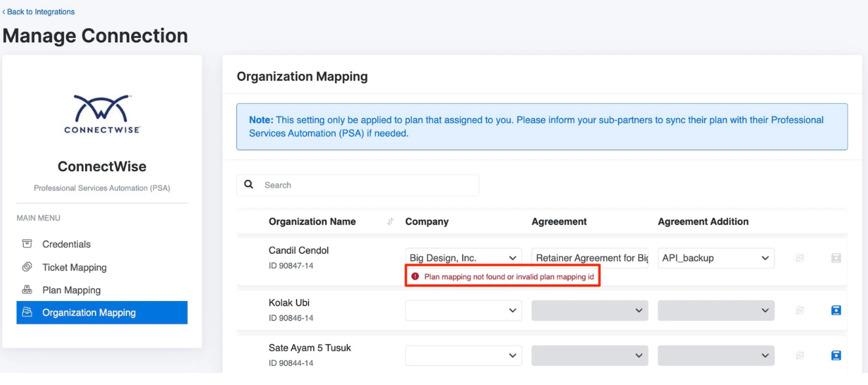 Sub-Wiederverkäufer haben zwar keinen Zugriff auf die Plan-Seite, können aber dennoch Pläne abbilden, die ihnen mit ConnectWise- und Autotask-Integrationen zugewiesen wurden. Sie können zur Seite Integration navigieren und dort auf Plan Mapping klicken.