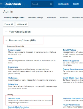 - Erweitern Sie Ressourcen/Benutzer (HR) und wählen Sie Sicherheitsstufen.