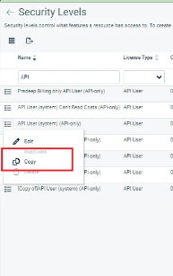 - Um eine neue Sicherheitsstufe zu erstellen, klicken Sie mit der rechten Maustaste auf die Sicherheitsstufe API User (system) (API-only) und wählen Sie die Option Kopieren.