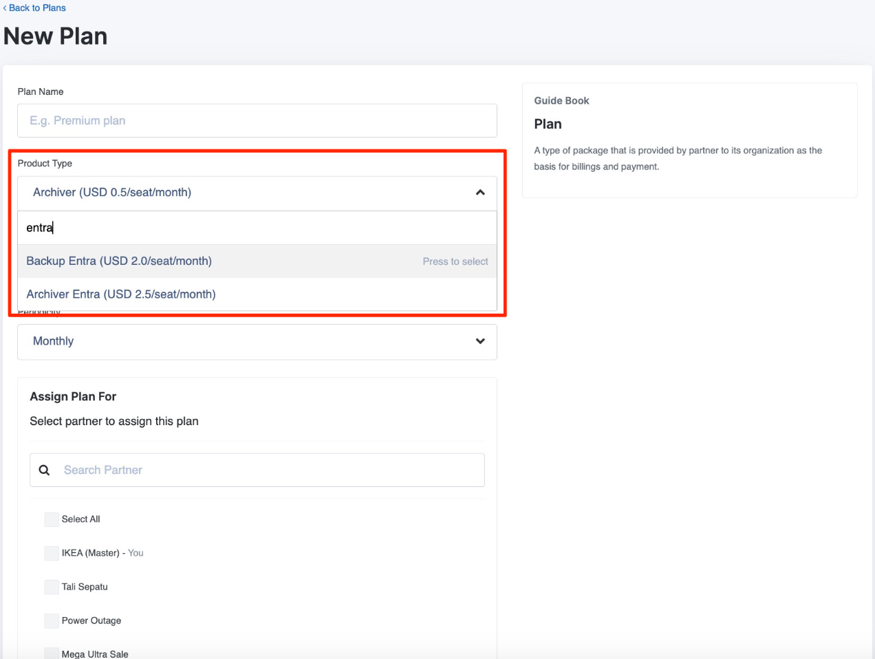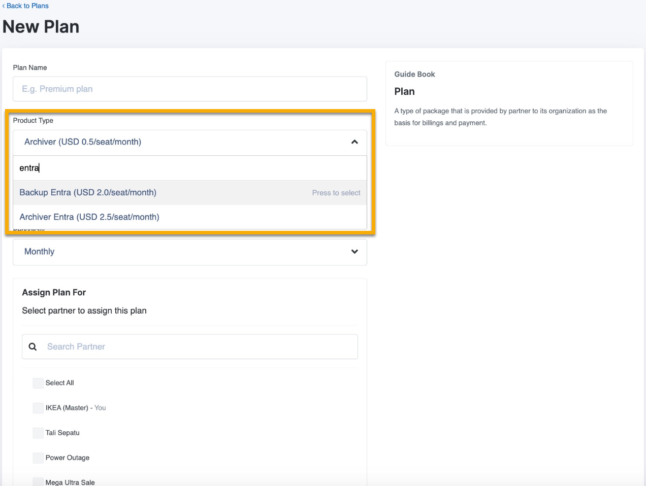 - Partner wählen: Wählen Sie den Partner aus, dem die Organisation angehört (erforderlich für die Auswahl eines Plans).