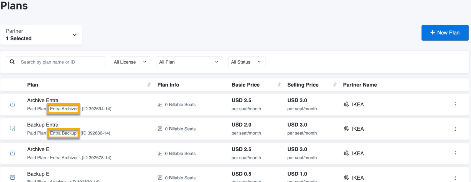 - Kostenpflichtige Pläne wie Entra Backup (Backup +Entra) und Entra Archiver (Entra+Archiver) können wie bestehende Backup- und Archivpläne erstellt und zugewiesen werden.