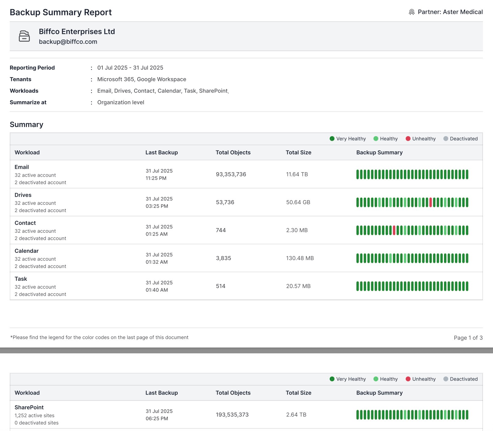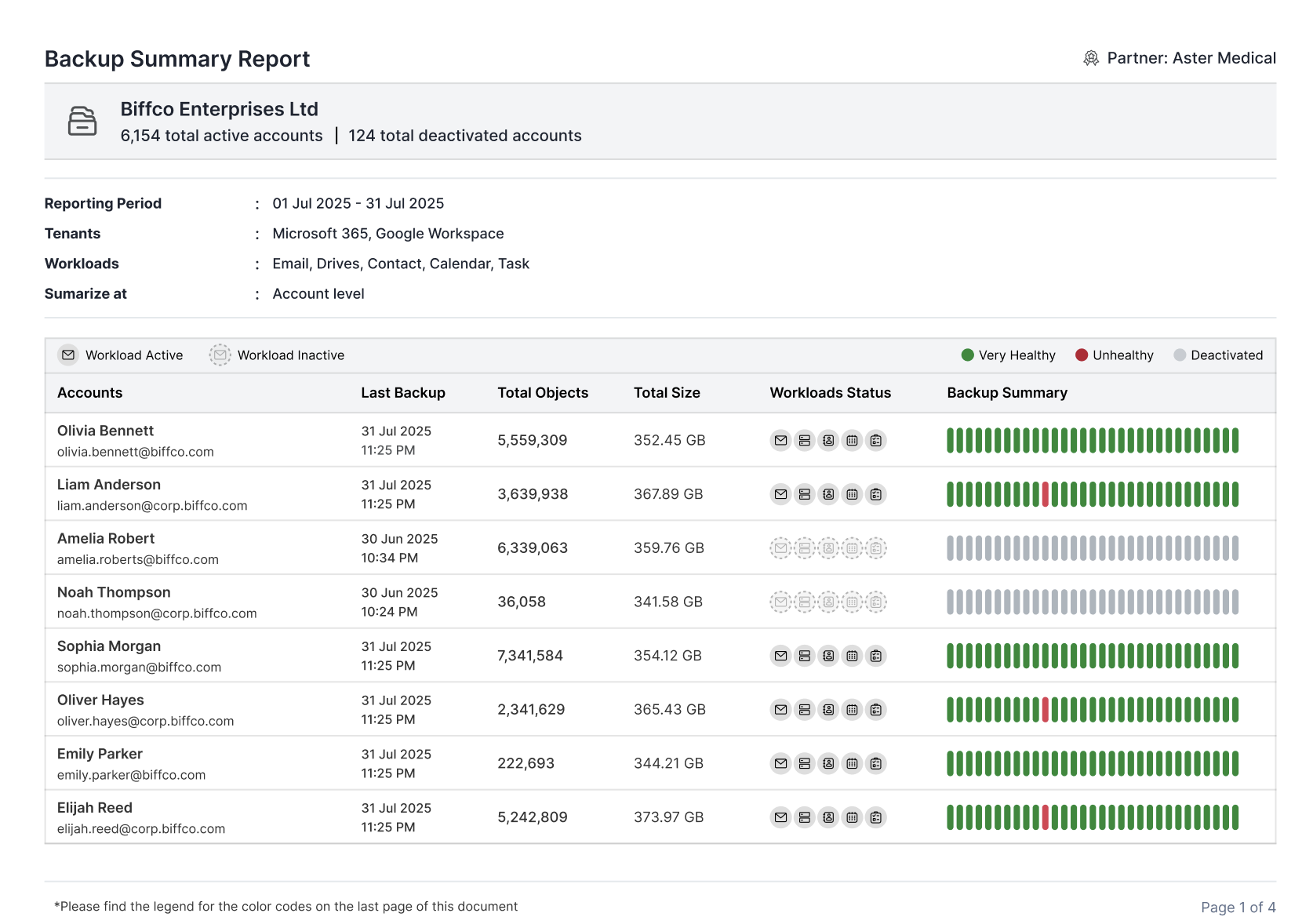 Der Backup-Zusammenfassungsbericht (BSR) zeigt den Zustand und die Abdeckung der Backups aller Benutzer und Workloads für den vergangenen Monat an. Es hilft den Partnern zu bestätigen, dass die Backups ihrer Benutzer wie erwartet laufen, und die Ergebnisse der Services einfach weiterzugeben. Gleichzeitig können die Unternehmen den Versicherungsschutz überprüfen, Probleme erkennen und Compliance- und Cyber-Versicherungsanforderungen erfüllen.