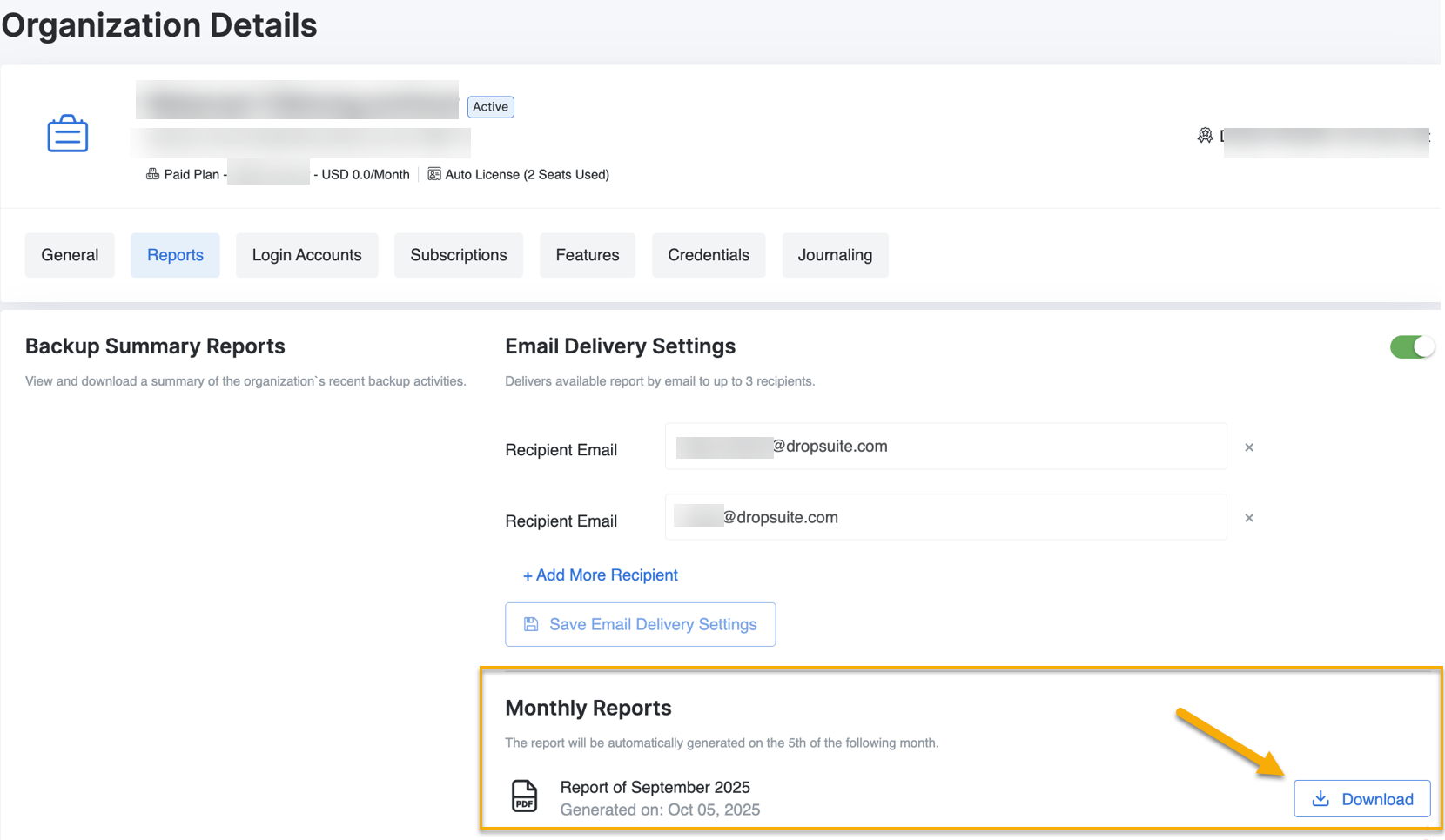 - Klicken Sie auf die Registerkarte Berichte. Dropsuite zeigt den neuesten Bericht im Abschnitt Monatsberichte an.