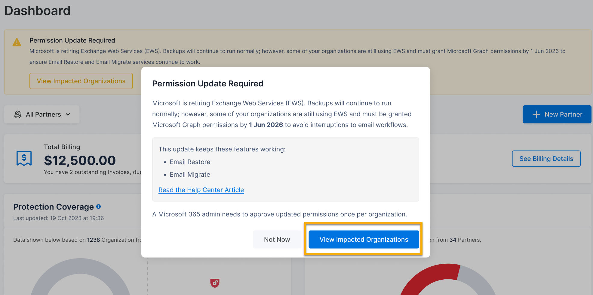 Sie erhalten sowohl im NinjaOne SaaS Backup Partner Portal als auch im Endbenutzer Portal eine Benachrichtigung, wenn ein Unternehmen Maßnahmen ergreifen muss. Wenn Sie keine Benachrichtigung erhalten, ist Ihr Konto derzeit nicht von diesem Problem betroffen.