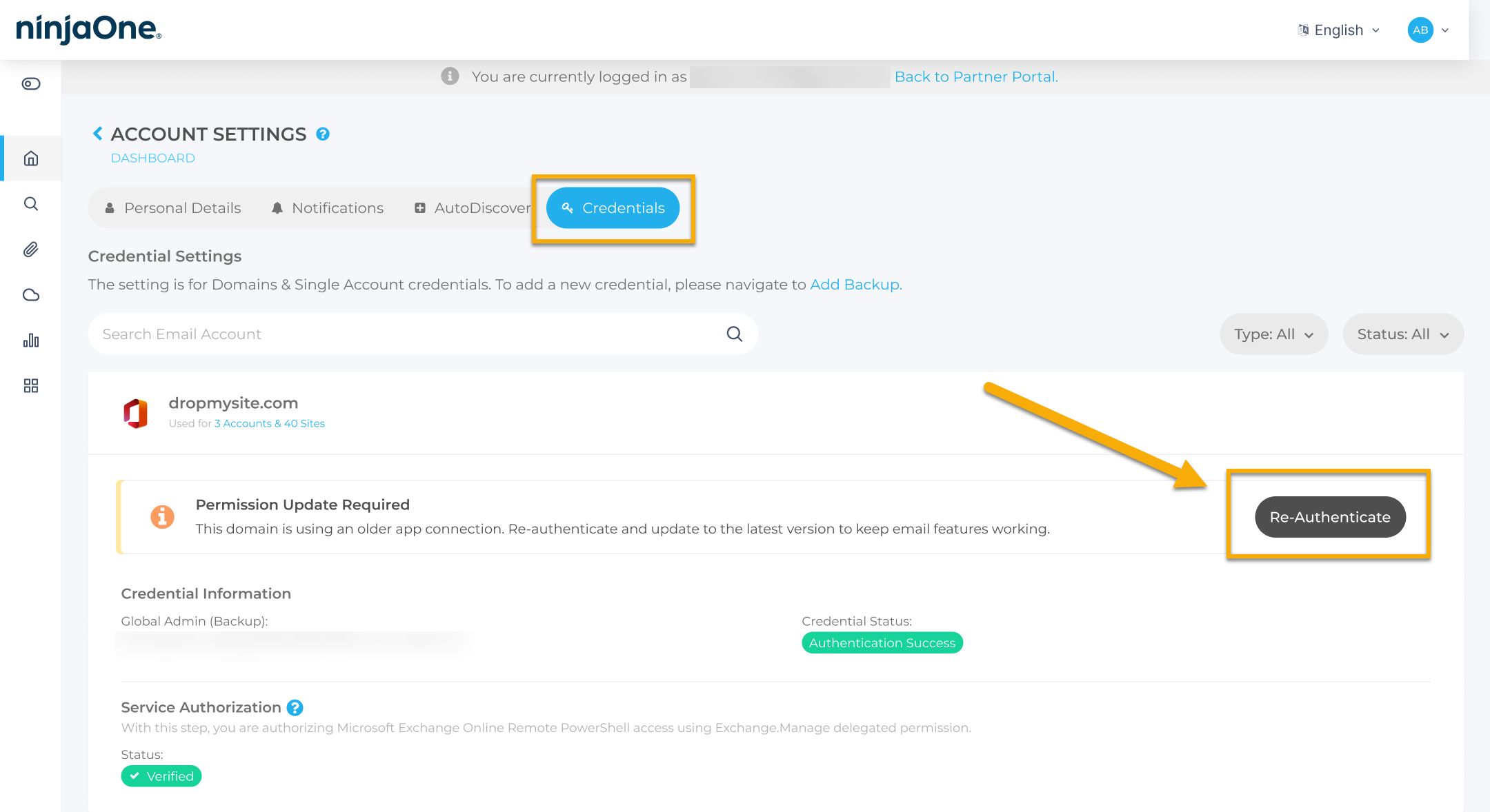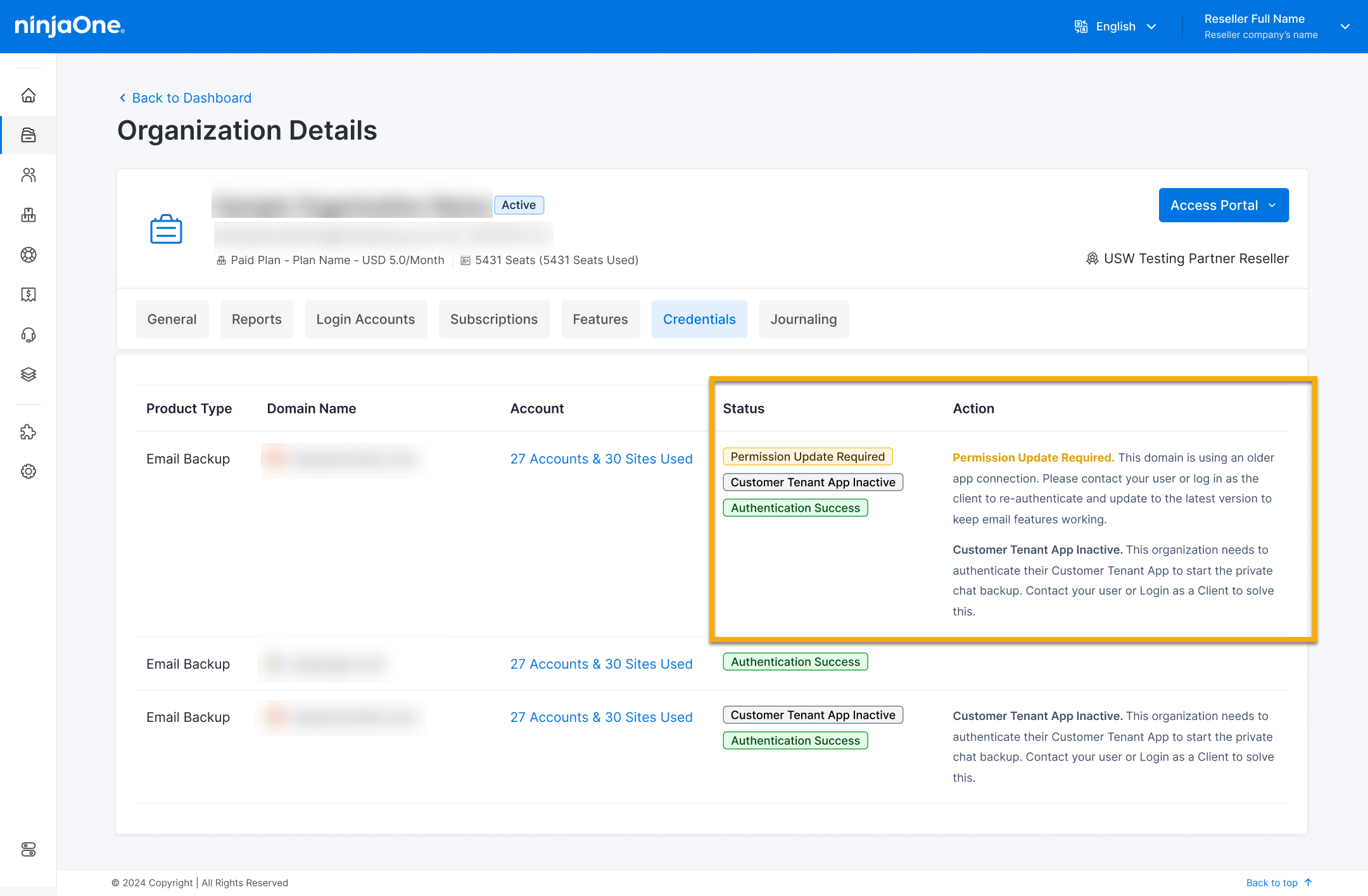 Partner und Wiederverkäufer können ihre Kunden auch unterstützen, indem sie über das NinjaOne SaaS Backup Partner Portal überwachen, welche Organisationen Maßnahmen ergreifen müssen, und ihre Kunden an die erneute Autorisierung erinnern und bei Bedarf Unterstützung anbieten.