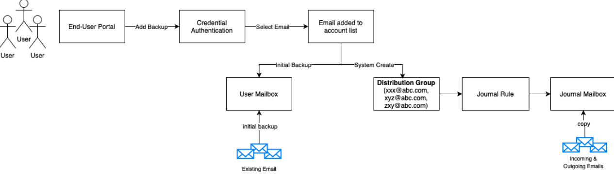 The following diagram illustrates how NinjaOne SaaS Backup Archive operates, from adding an email account for backup to authenticating, journaling, and storing emails in real-time. It provides a clear overview of the key steps in the archiving process.