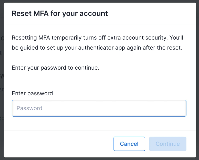 - A Reset Multi-factor Authentication prompt will appear. Enter your login password to verify your identity, then click Continue to proceed with the reset.