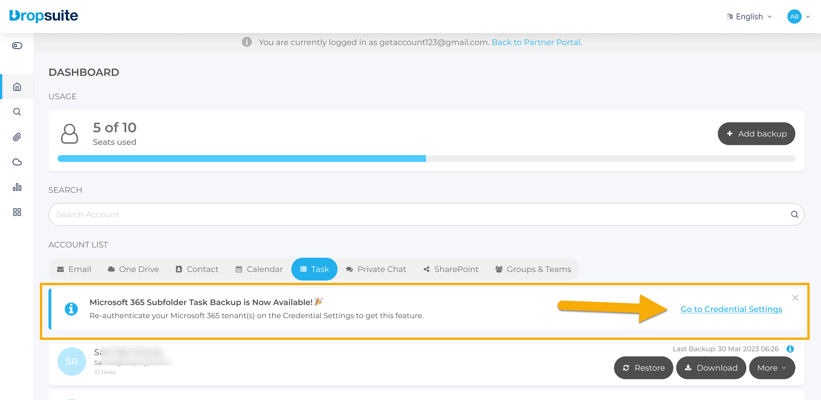 When you add a Google Workspace email account to Dropsuite, you can back up and restore tasks without any further setup required. For more information on adding a Google Workspace account to Dropsuite, review Google Workspace Backup and Archiving Guide.