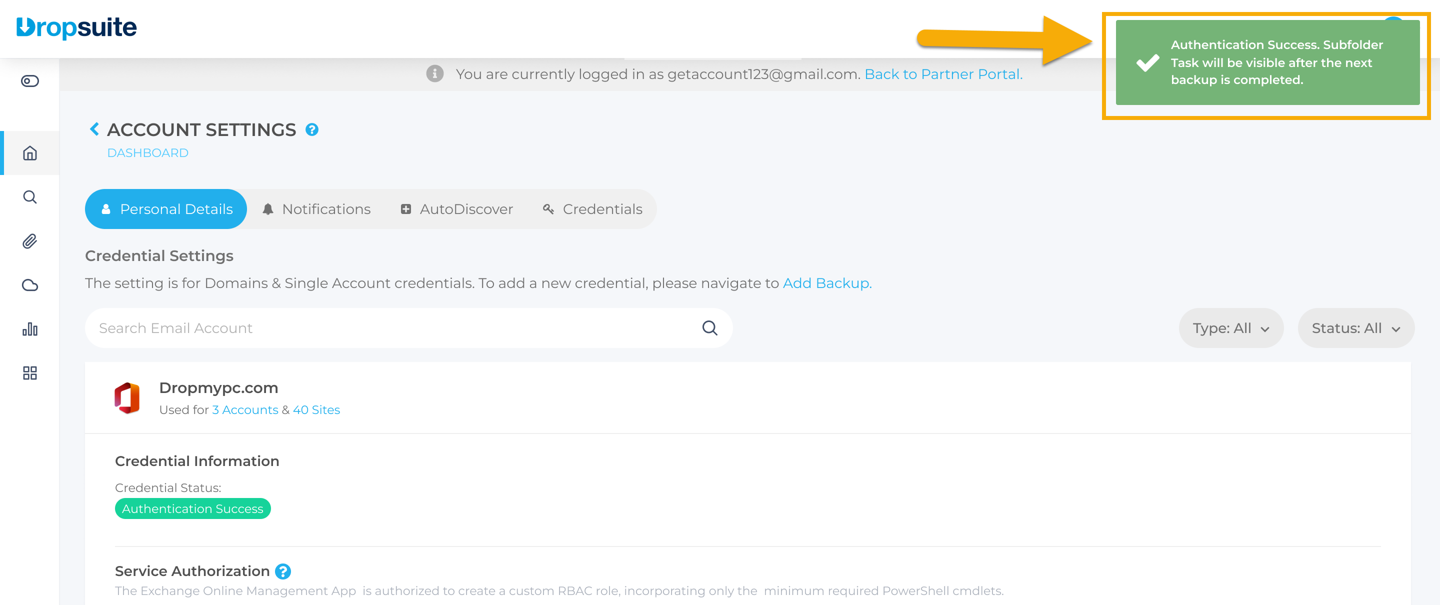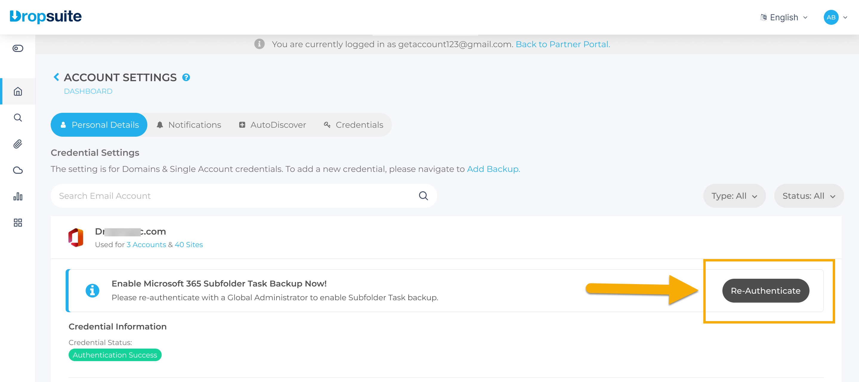- If re-authentication is successful, an authentication success notification will appear on the Account Settings page, and the re-authenticate option will no longer be displayed.