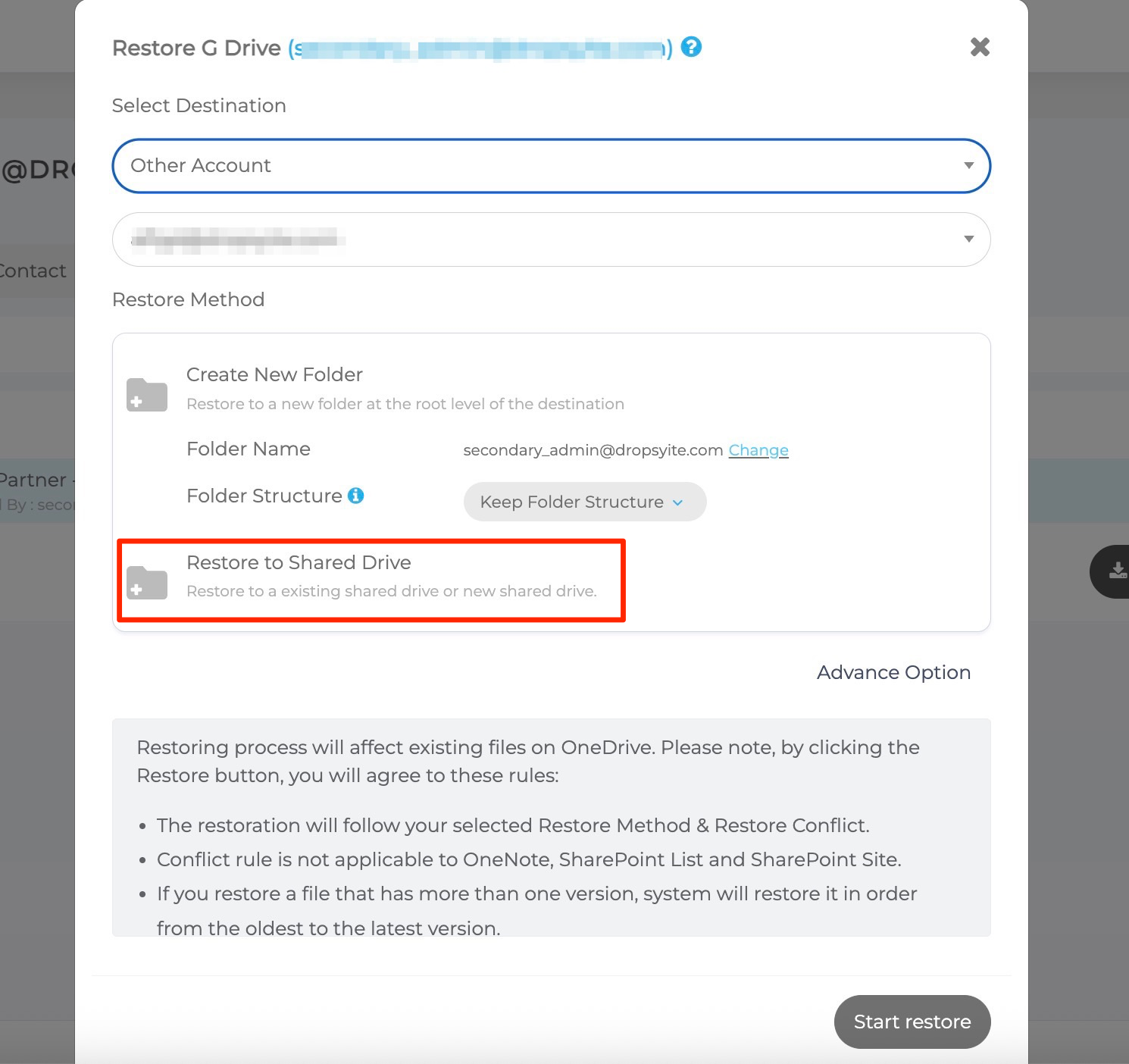 - Configure the settings as described in the Restore Entire Google Drive section of this article and confirm the restore.