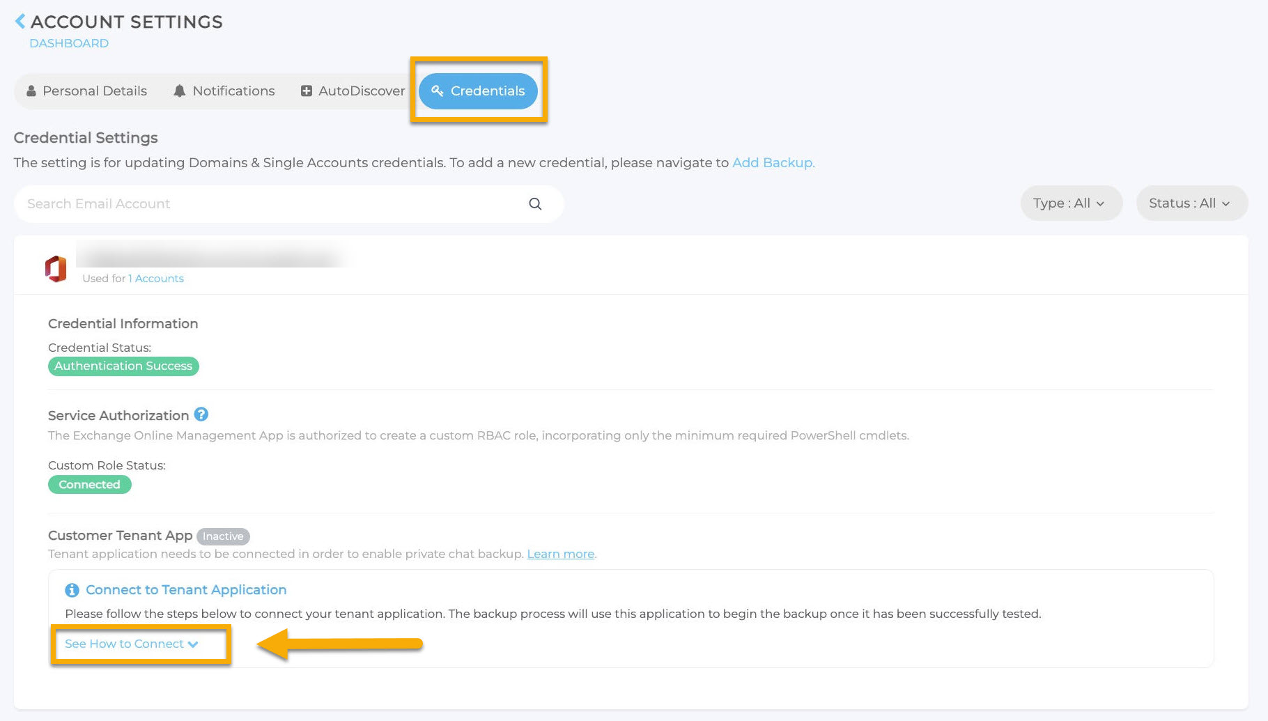 - NinjaOne SaaS Backup will redirect you to the Credentials tab on the Account Settings page. Click Reauthenticate to authorize the backup admin account to reauthenticate. Once reauthentication is complete, all Microsoft 365 (M365) accounts currently backed up will display in the Private Chat tab with an INACTIVE status.