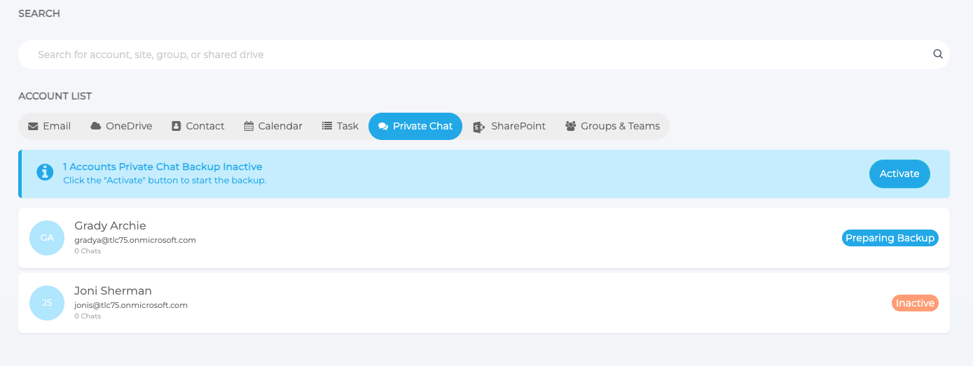 NinjaOne SaaS Backup includes private chat backup by default for organizations with the Archiver plan. However, backup does not start automatically. To begin backing up private chats, you must first complete the credential setup and then activate backups.