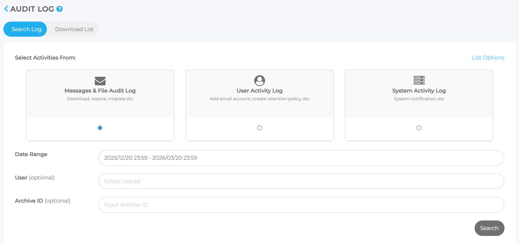 - On this tab, you can search audit logs by various activities, including messages and files, users, and system activities.